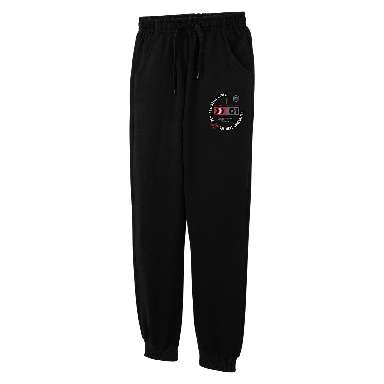 Bequeme schwarze Jogginghose für Jungen aus 100 % Baumwolle sorgt für Tragekomfort und Atmungsaktivität. Sie verfügt über einen elastischen Bund mit Kordelzug , elastische Bündchen und praktische Taschen . Ein stylischer Print am Bein verleiht der Hose einen sportlichen Touch. Perfekt für den Alltag, die Schule und einen aktiven Tag.
