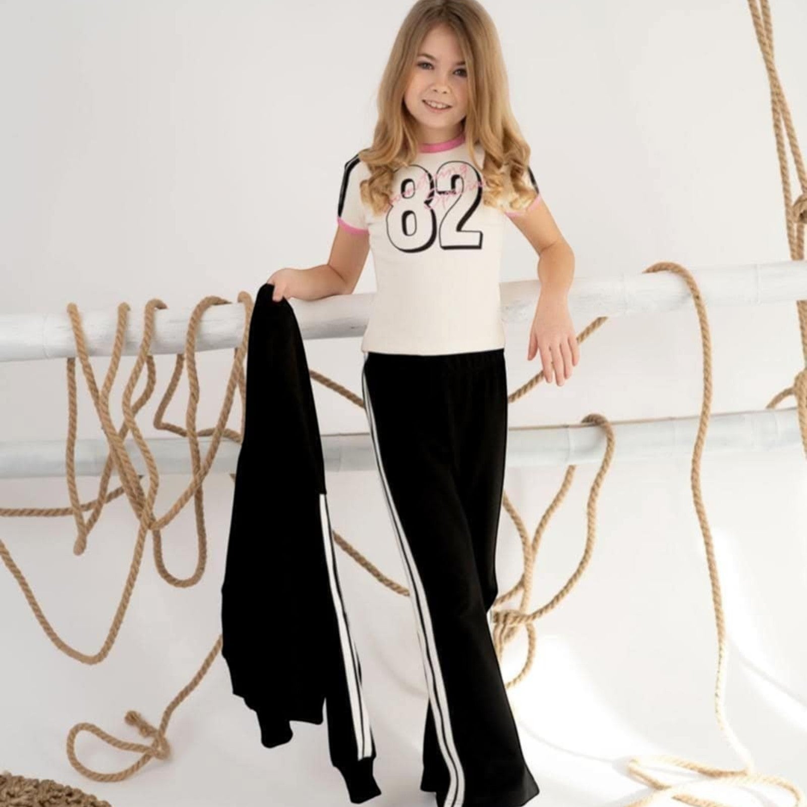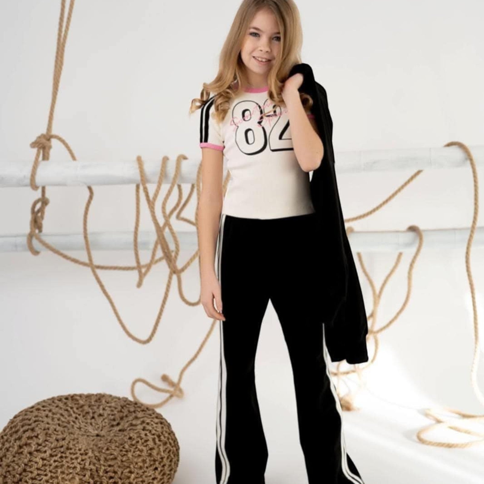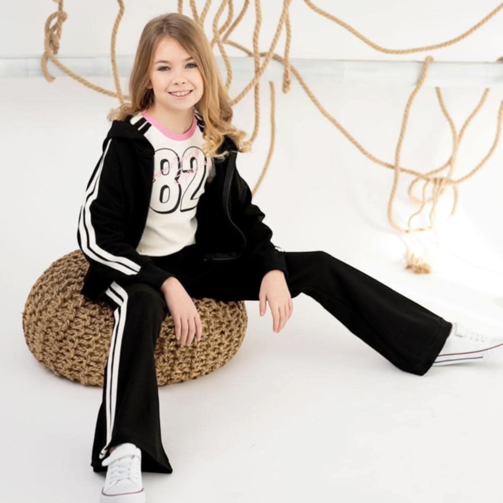 Stylische Schlaghose mit Seitenstreifen in klassischem Schwarz. Gefertigt aus weichem Sweatstoff bietet sie höchsten Tragekomfort. Dekorative weiße Seitenstreifen entlang der Beine verleihen ihr eine sportliche Note und setzen modische Akzente. Der lockere Schnitt mit ausgestelltem Bein eignet sich perfekt für lässige Outfits. Der Verzicht auf Taschen und Verschlüsse unterstreicht das minimalistische Design.