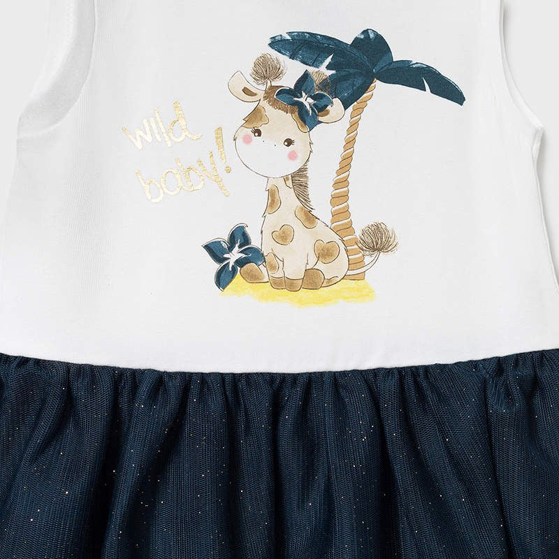 2-teiliges Kinderkleid: ein gestreiftes Top mit Schleife und ein Trägerkleid mit bedrucktem Tüll für ein Mädchen von Mayoral aus der Frühjahr/Sommer Baby Mädchen Kollektion, Produktcode 1976, Farbe 61 Navy Blue. Kinderbekleidung.