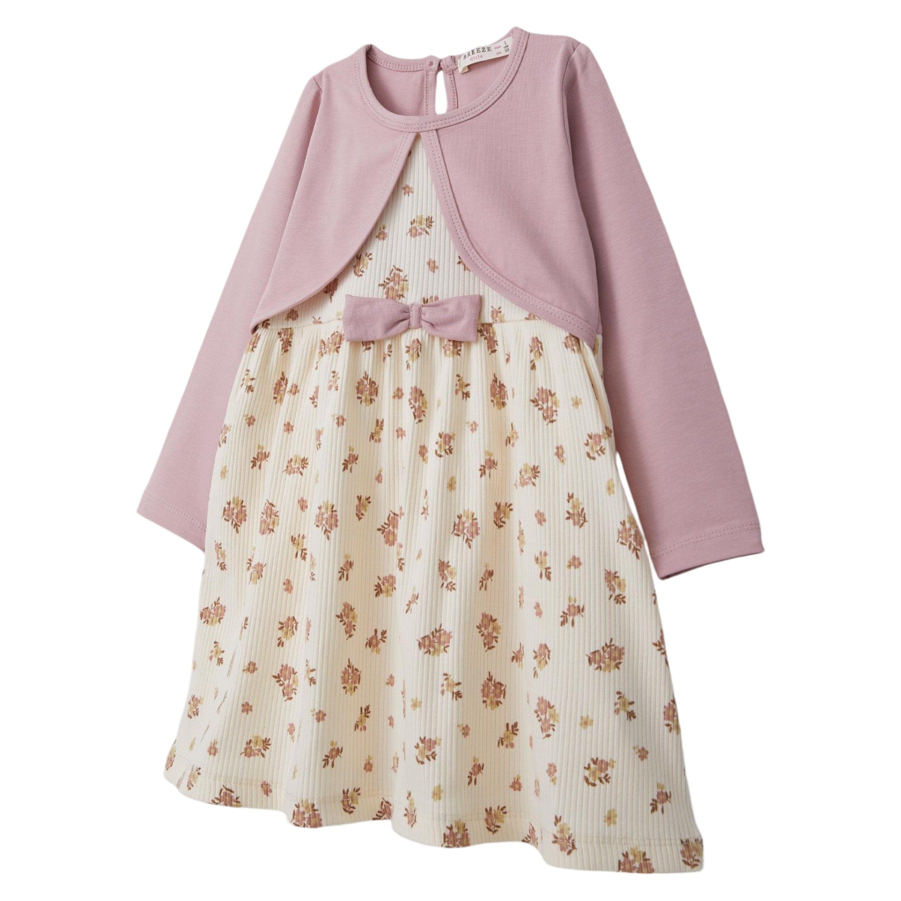 Das Oberteil des Kleides besteht aus einem glatten, gerippten Material in einem zarten Lilaton und verleiht ihm einen eleganten, klassischen Touch. Der untere Teil hingegen ist ein Hingucker. zartes Blumenmuster auf hellem Hintergrund, was dem Kleid einen Hauch von Leichtigkeit und mädchenhaftem Charme verleiht. Dieses Muster verleiht dem Styling einen Hauch von Frische und gibt dem Kleid einen stilvollen Look, der sowohl für den Alltag als auch für besondere Anlässe wie Familienfeiern, Besuche bei Freunden oder Feiertagstreffen geeignet ist.