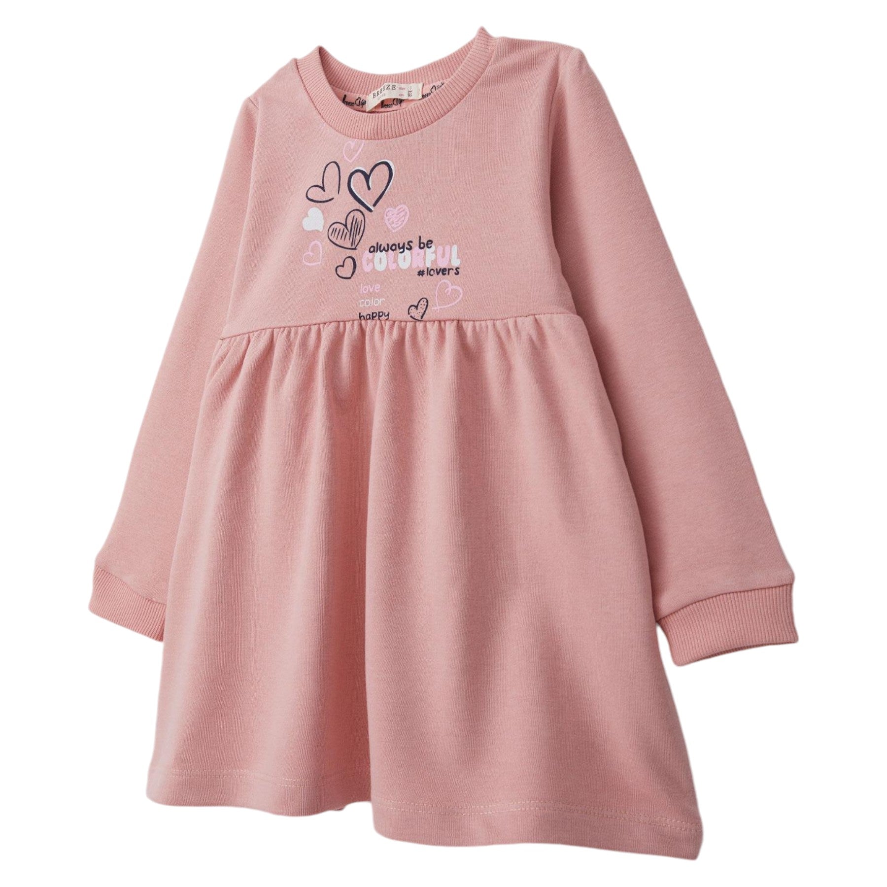 Das Design des Kleides ist sehr mädchenhaft und dezent. Herz-Prints und ein Textmotiv verleihen ihm eine leichte und verspielte Note. Die langen Ärmel schützen zusätzlich vor Kälte und die lockere Passform sorgt für Bewegungsfreiheit im Alltag. Der leicht ausgestellte Saum des Kleides sorgt für einen schönen Fall beim Spazierengehen oder Spielen.