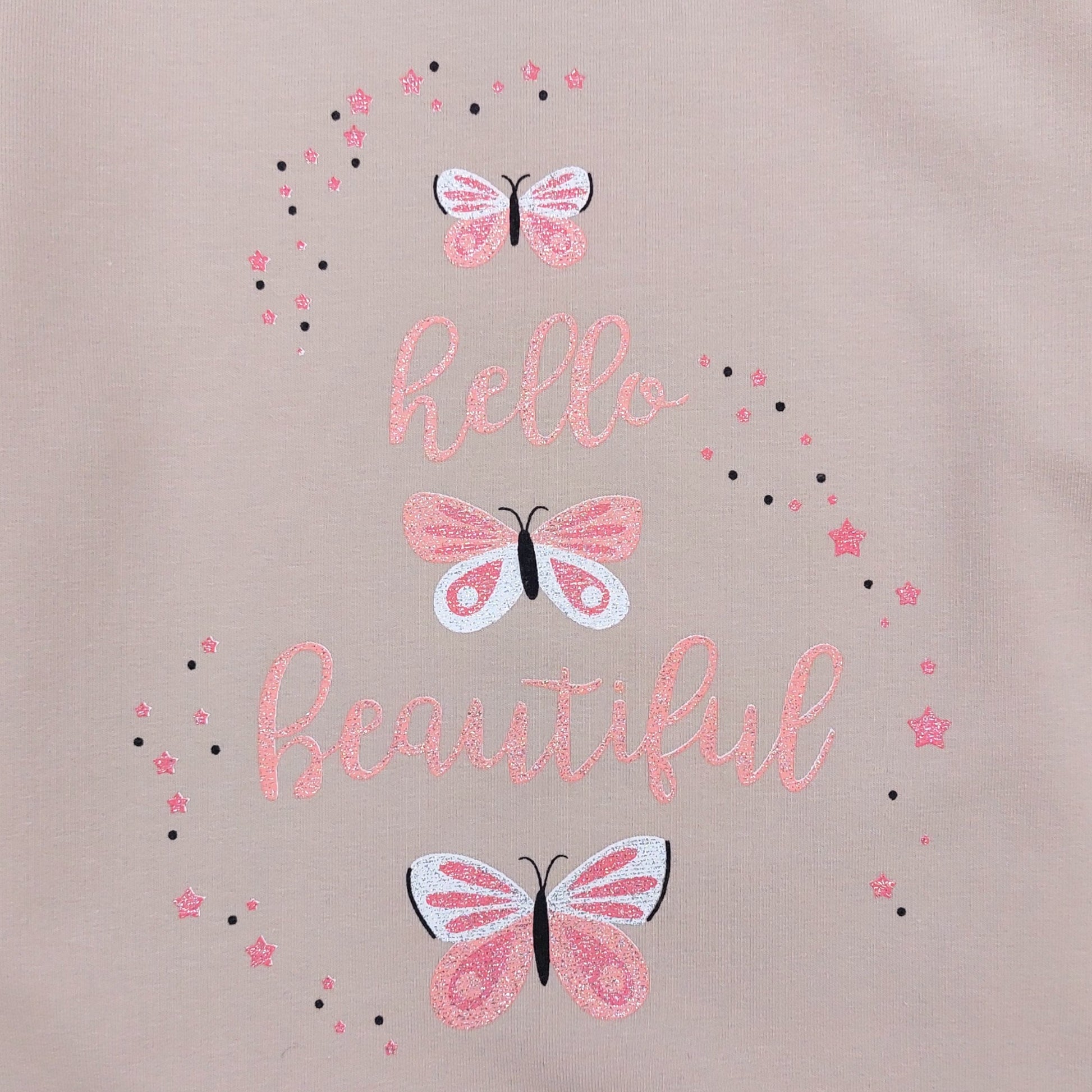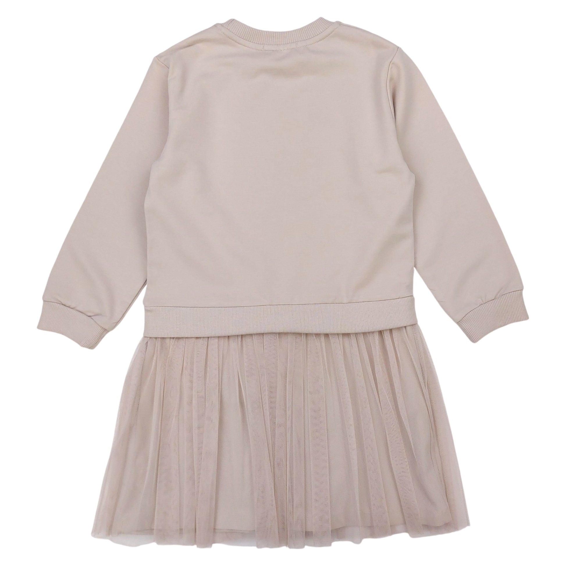 Ein mädchenhaftes beiges Kleid mit Tüllrock, perfekt für die Herbst- und Wintersaison . Das Oberteil ist mit einem Schmetterlingsprint und dem Schriftzug „Hello Beautiful“ verziert, während der zarte Tüll dem Kleid Leichtigkeit und Charme verleiht. Das Kleid hat lange Ärmel , keine Taschen oder Verschlüsse und wird über den Kopf gezogen.