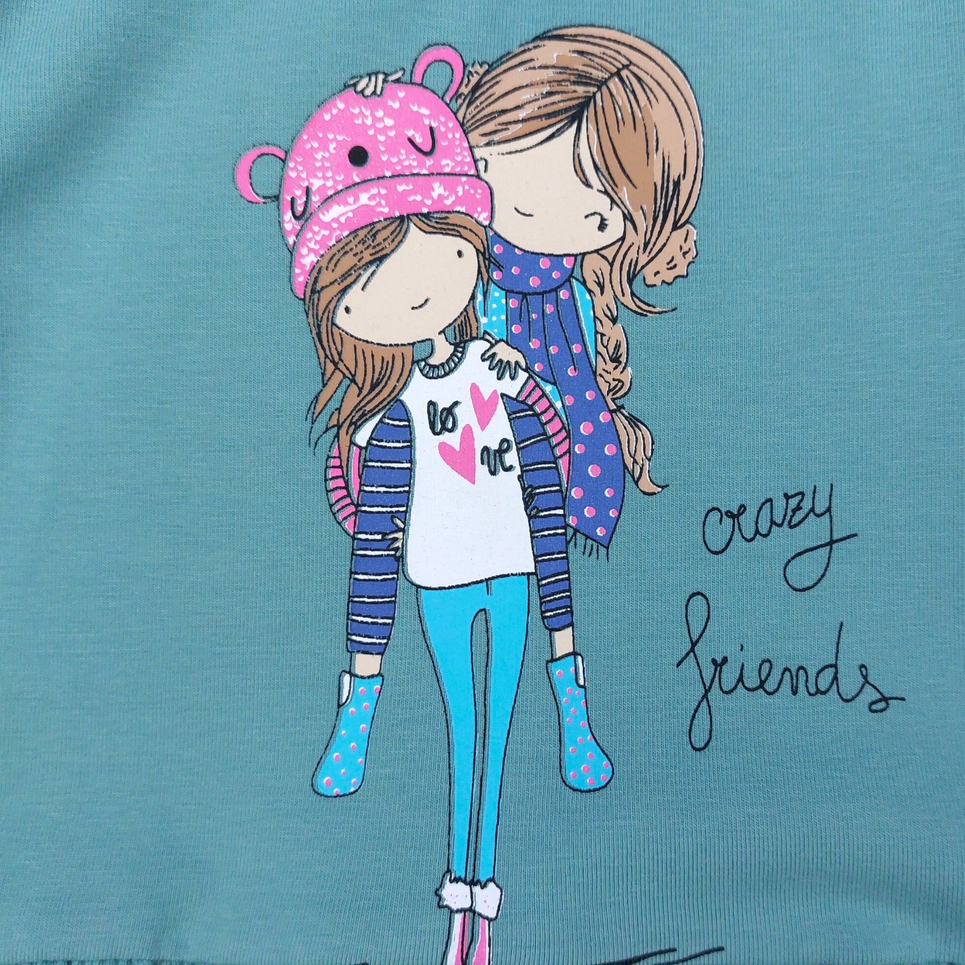 Der charmante Print auf der Vorderseite zeigt zwei Freunde in farbenfroher Kleidung und der Aufschrift „Crazy Friends“, die dem Kleid einen fröhlichen, mädchenhaften Charakter verleiht. Bedrucktes Kleid Dies ist eine großartige Option für jedes Mädchen, das jeden Tag modisch und bequem aussehen möchte. Der ausgestellte Saum des Kleides verleiht einen Hauch von Leichtigkeit und macht es nicht nur stilvoll, sondern auch sehr praktisch.