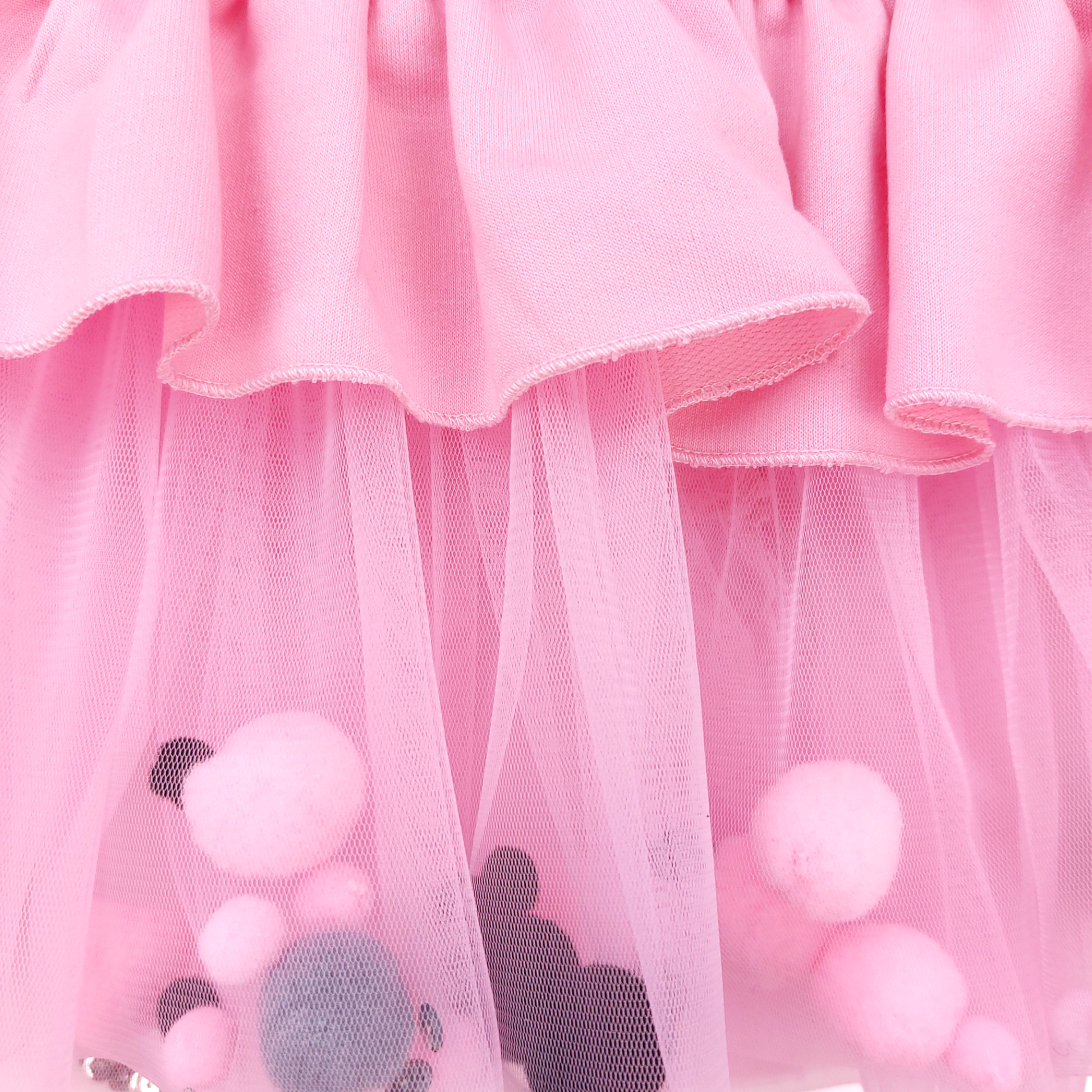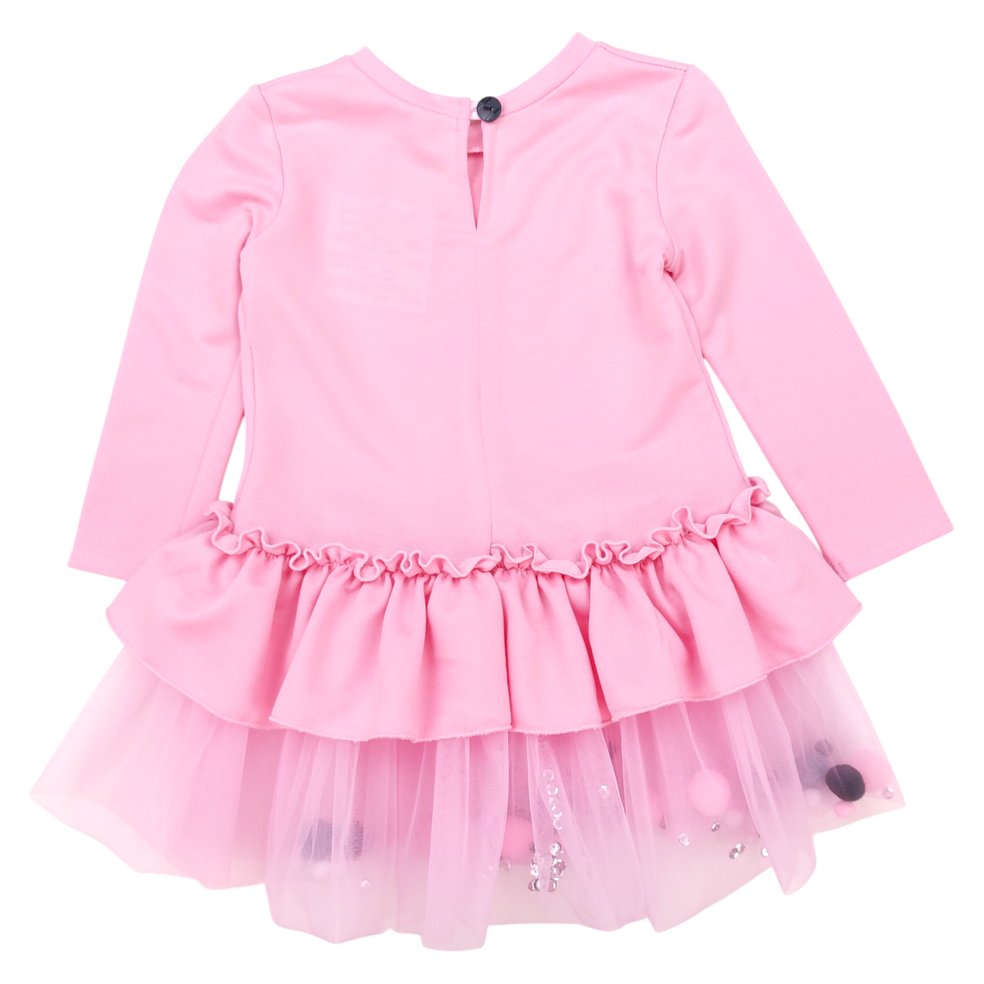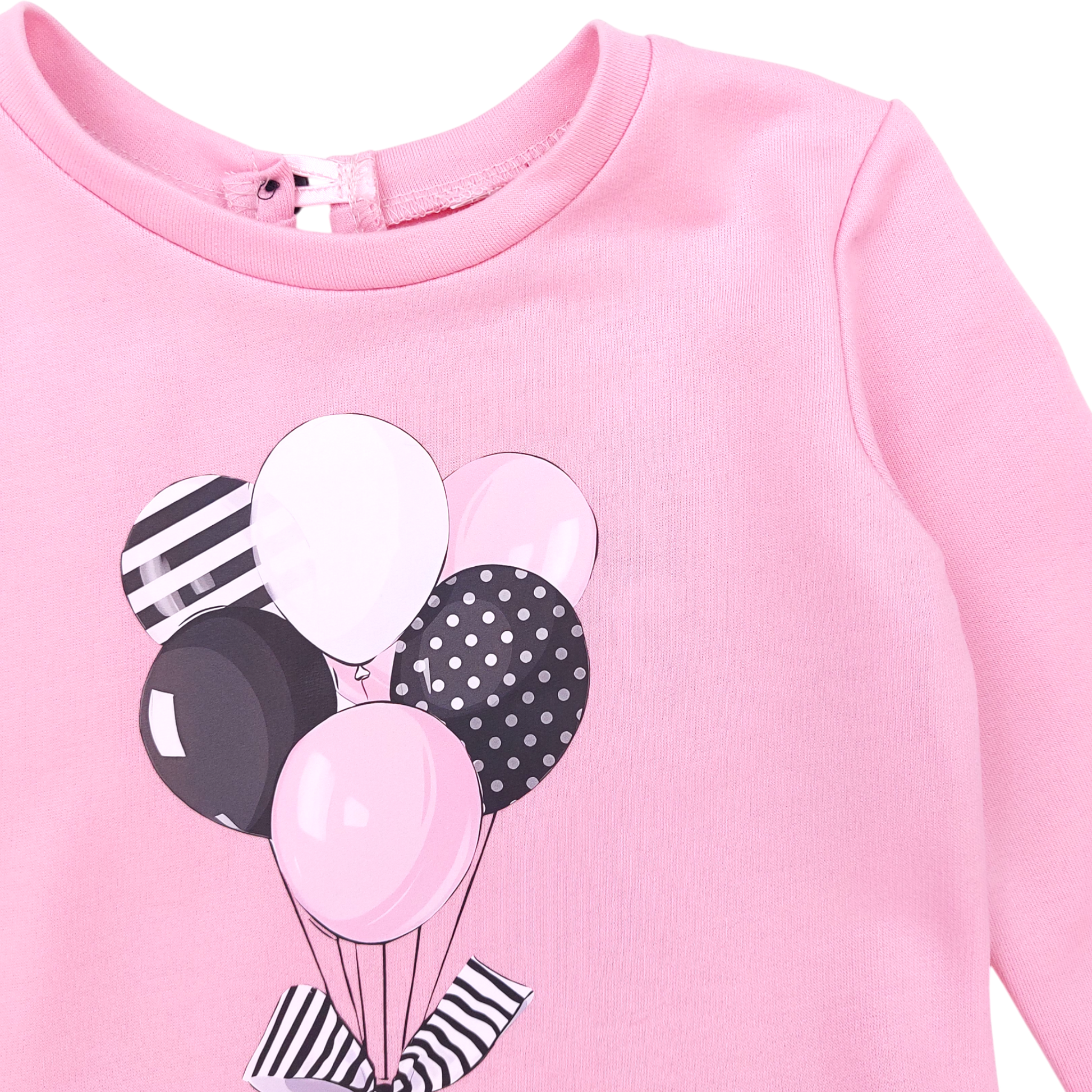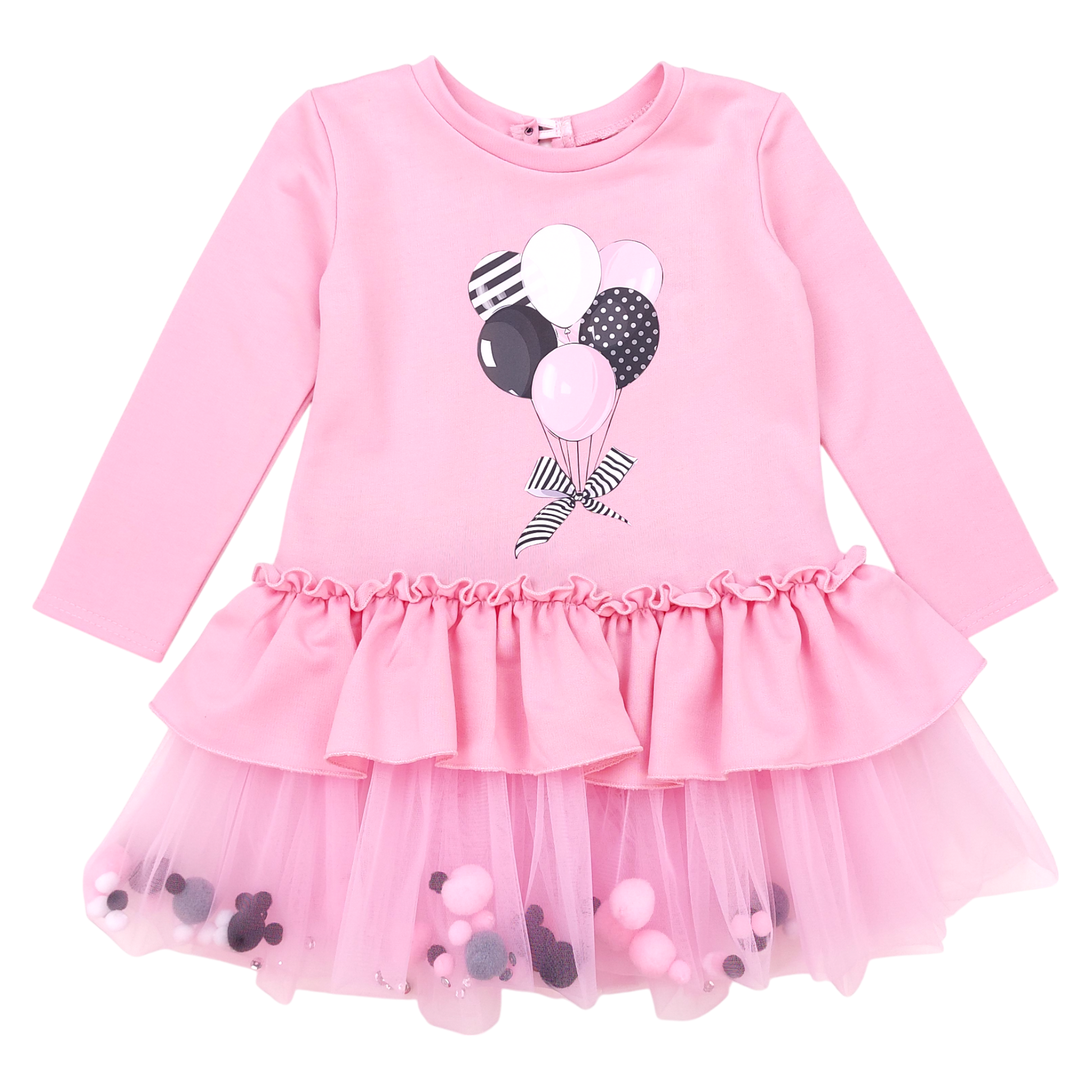 Dieses bezaubernde rosa Kleid für Mädchen ist perfekt für die Herbst- und Wintersaison. Der Ballon-Print auf dem Oberteil und der Tüllrock mit bunten Pompons verleihen ihm eine einzigartige Note. Das langärmlige Design mit dezenten Rüschen unterstreicht den mädchenhaften Charme.