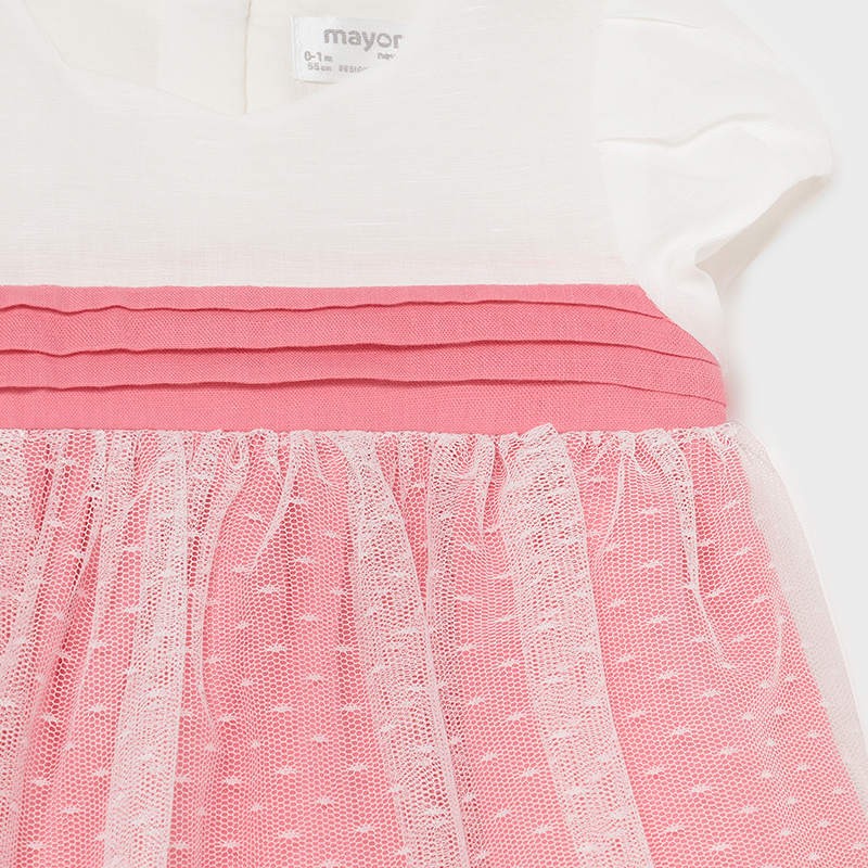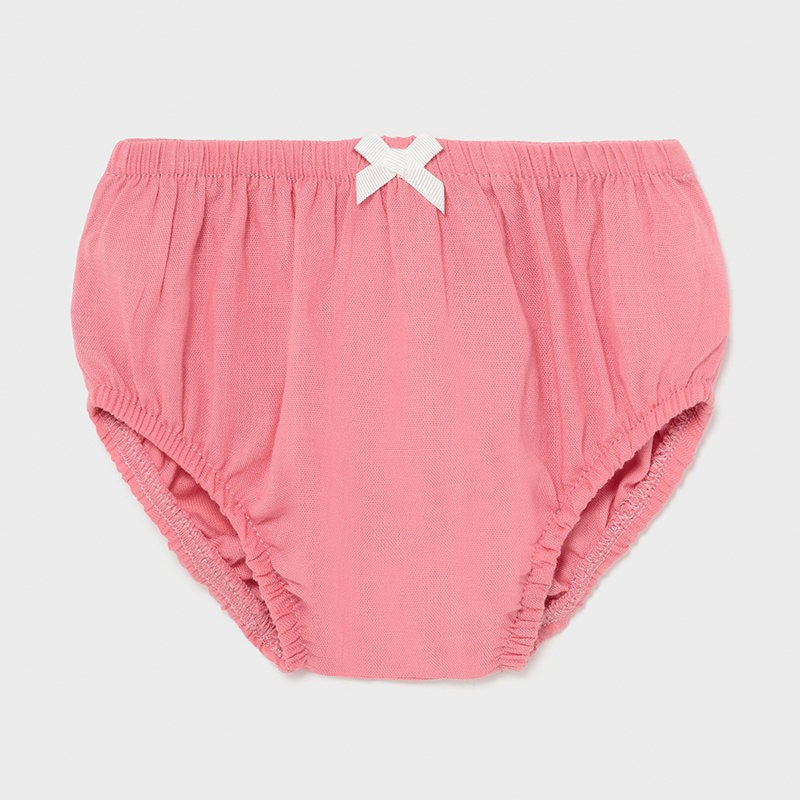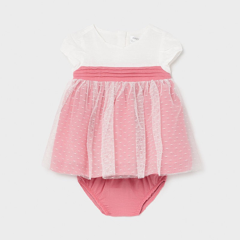 Elegantes Kinderkleid mit kurzen Ärmeln und Höschen für Mädchen von Mayoral aus der Frühjahr/Sommer-Kollektion für Neugeborene Mädchen, Produktcode 1823, Farbe 63 Macaroon. Kleidung für Neugeborene.