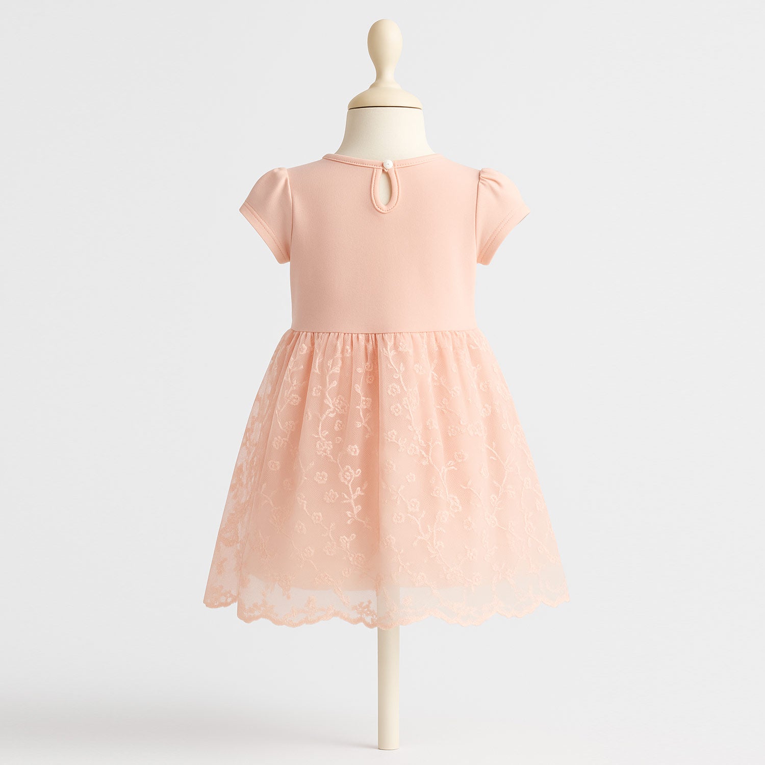 Dieses wunderschöne Kleid für Mädchen ist der Inbegriff von Eleganz und Zartheit. Es ist aus hochwertigen Materialien gefertigt, darunter weiche Baumwolle und dehnbares Lycra, und bietet selbst an einem langen Tag voller Spiel und Spaß höchsten Tragekomfort. Der dezente Apricot-Ton des Kleides harmoniert perfekt mit der zarten Spitze, die das gesamte Kleidungsstück ziert. Das Oberteil hat kurze Ärmel, die ihm ein charmantes und luftiges Tragegefühl verleihen. Die Rückseite verfügt über einen praktischen Knopfverschluss, der nicht nur das Anziehen erleichtert, sondern auch ein interessantes Detail darstellt. Der fließende Spitzenrock bewegt sich wunderschön mit jeder Bewegung und sorgt für einen mädchenhaften und romantischen Look. Dieses Outfit ist jungen Damen gewidmet, die jeden Tag außergewöhnlich aussehen und sich wohlfühlen möchten. Es ist perfekt für Frühlings- und Sommerfeste, von Familienfeiern bis hin zu besonderen Anlässen. Die perfekte Wahl für jedes Mädchen, das sich wie eine echte Prinzessin fühlen möchte.