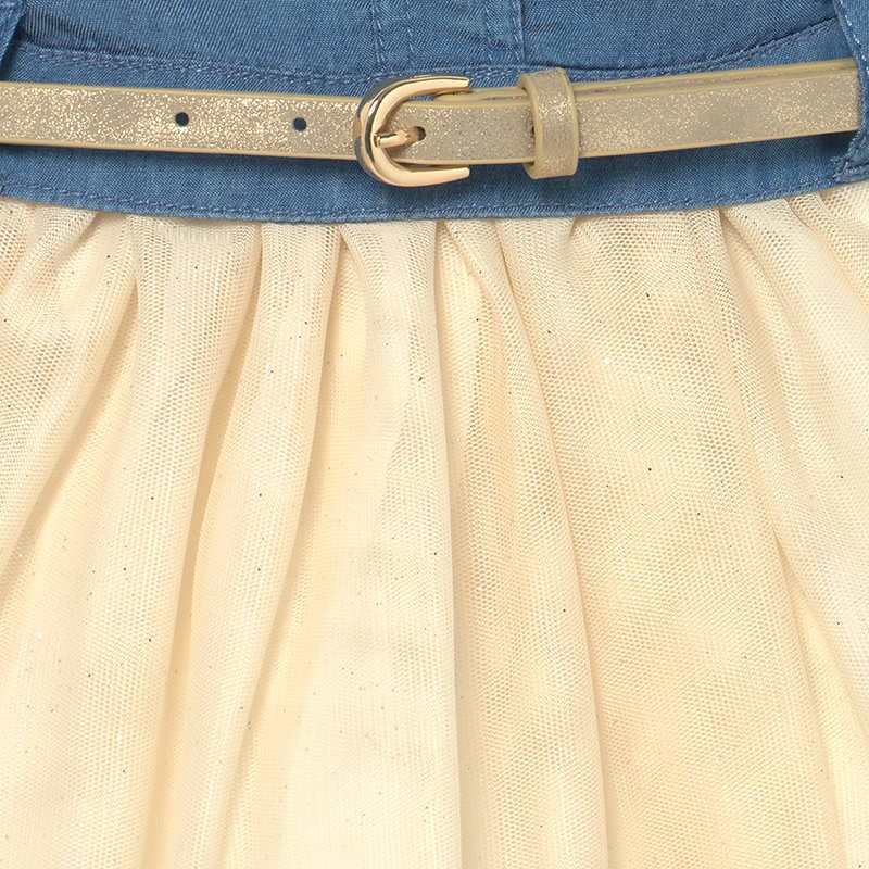 Kinder-Jeanskleid mit Tüll, kurzen Ärmeln, Kragen und Gürtel, aus der Mayoral Baby-Mädchen-Kollektion für die Saison Frühjahr/Sommer, Produktcode 1989, Farbe 5, Jeans/Beige. Kinderkleidung.