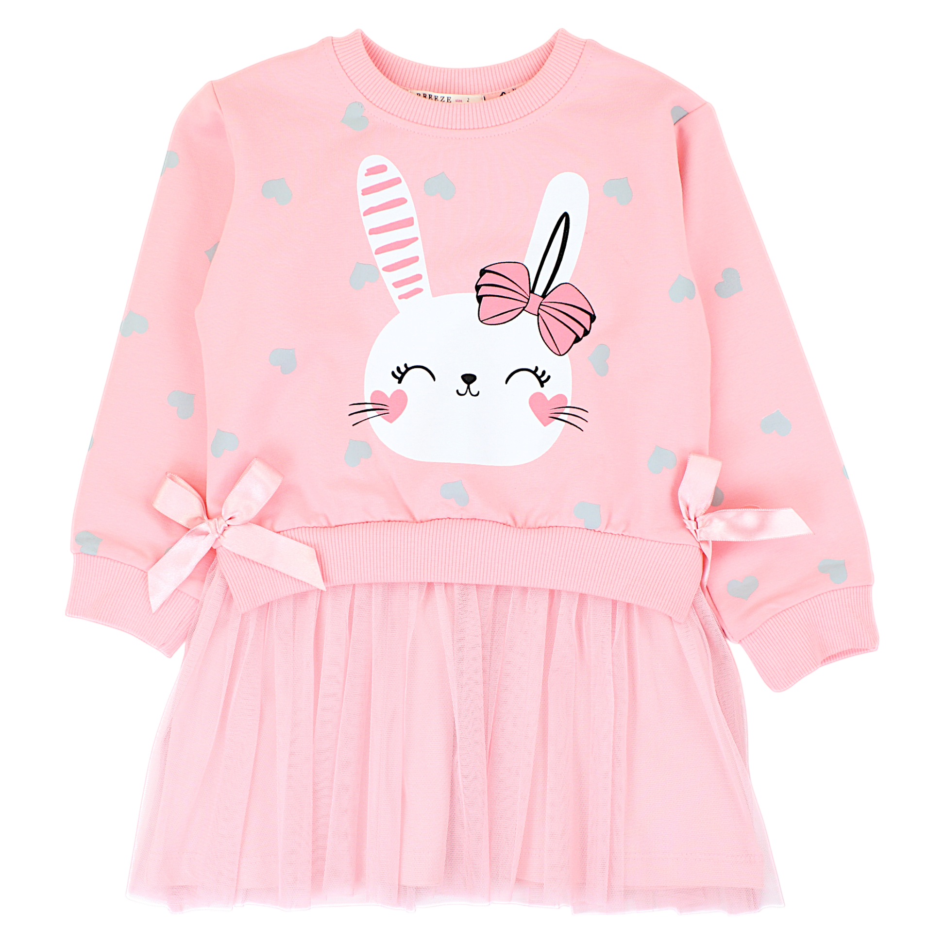Das Oberteil des Kleides ähnelt Langarm-Sweatshirt , die Ihr Baby warm und bequem hält. Verziert mit einem bezaubernden Druck Hase mit Schleife , wird jeder kleinen Prinzessin gefallen. Herzen Auf der gesamten Stoffoberfläche sorgen sie für noch mehr mädchenhaften Charme. Tüllboden verleiht dem Styling Leichtigkeit und lässt das Kleid elegant wirken. Die Ärmel sind dekorative Satinschleifen , die das Ganze ergänzen und den zarten, mädchenhaften Stil betonen.