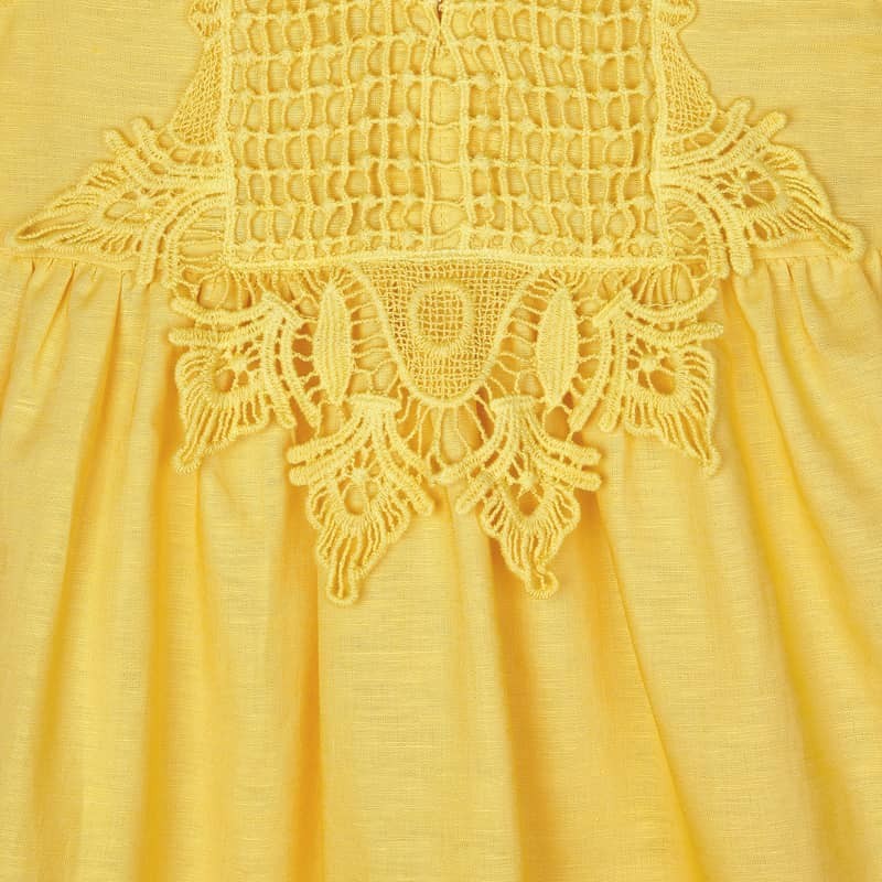 Kinder-Leinenkleid mit Guipure-Spitze an Trägern mit Rüschen für Mädchen von Mayoral aus der Mini-Girl-Frühjahr/Sommer-Kollektion, Produktcode 3931, Farbe 61 Senf. Kinderbekleidung.