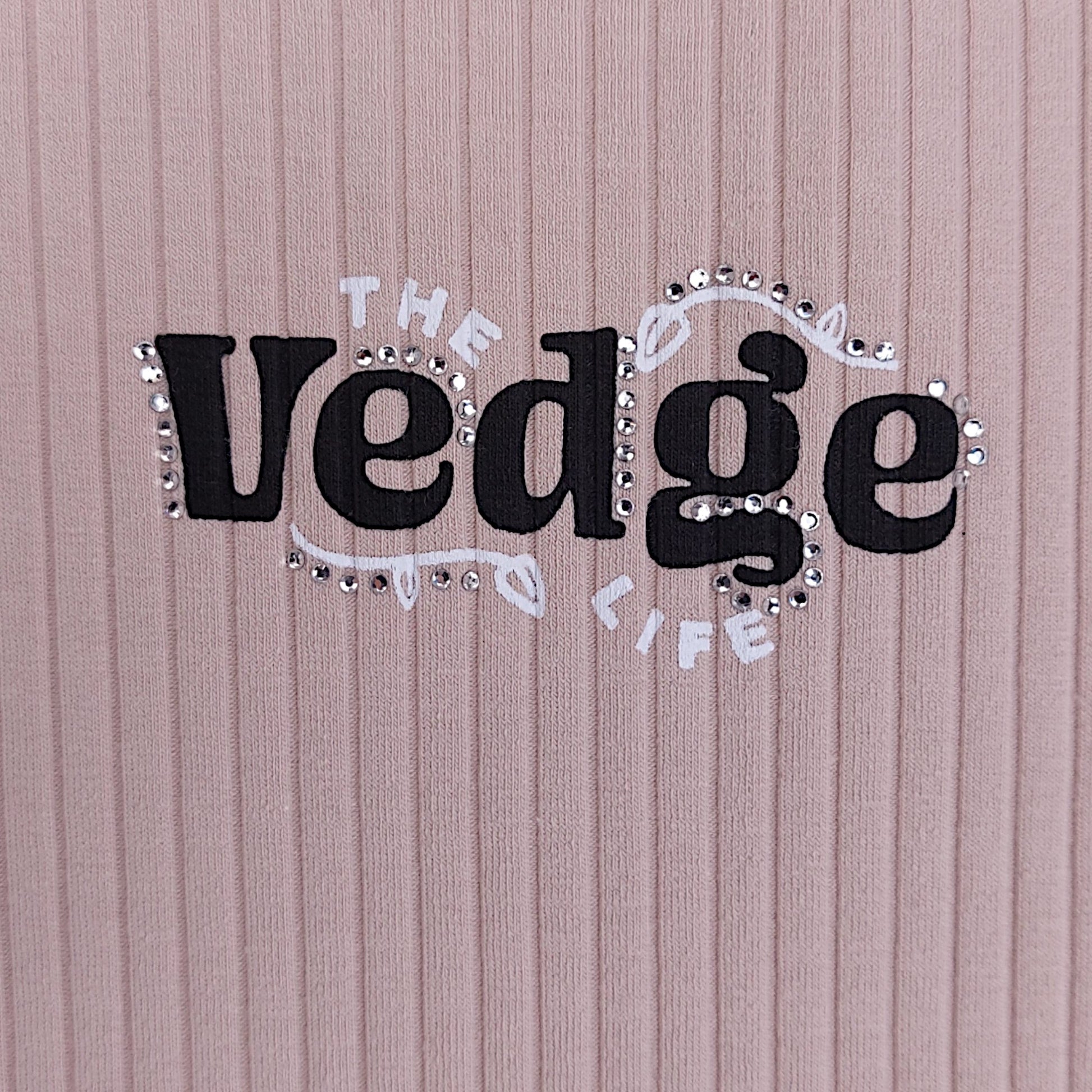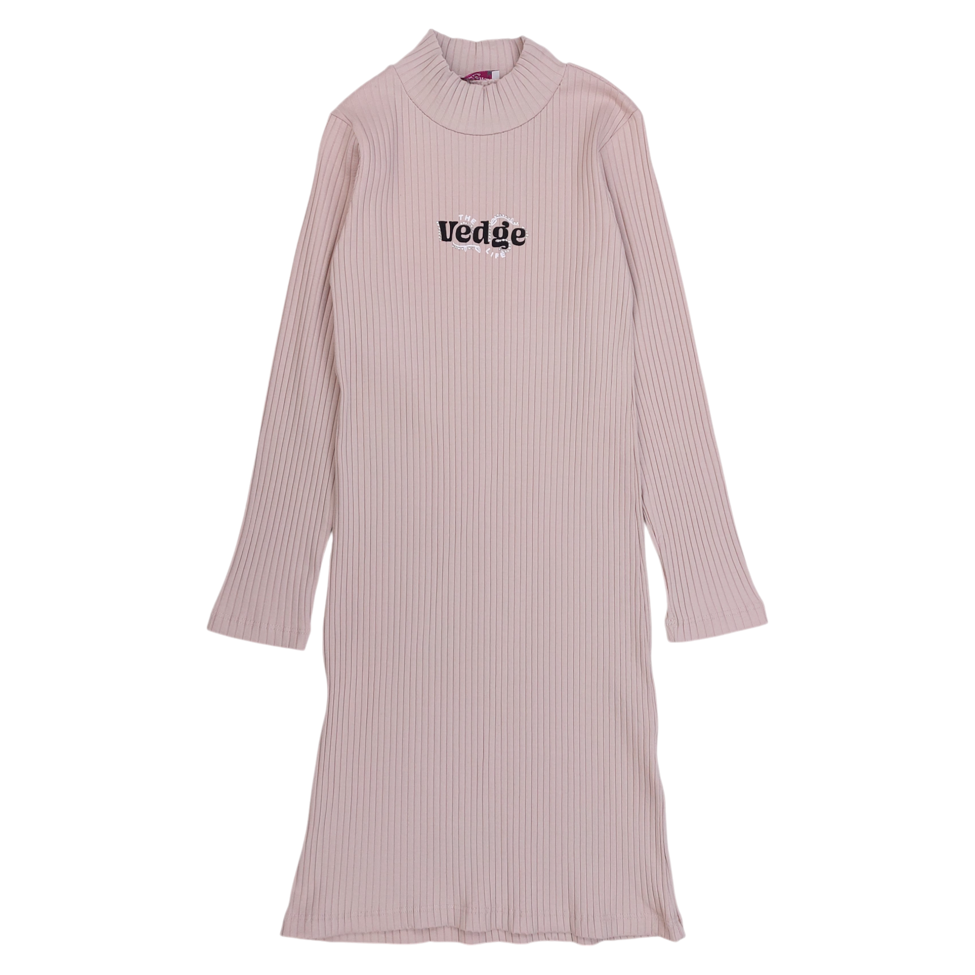 Dieses stilvolle beige Kleid für Mädchen ist aus geripptem Stoff gefertigt. Es hat lange Ärmel, einen dezenten „The Vedge Life“-Print mit kleinen Kristallen und einen Rollkragen für einen Hauch von Eleganz. Das Kleid ist dehnbar und passt sich Ihrer Figur für mehr Komfort an.