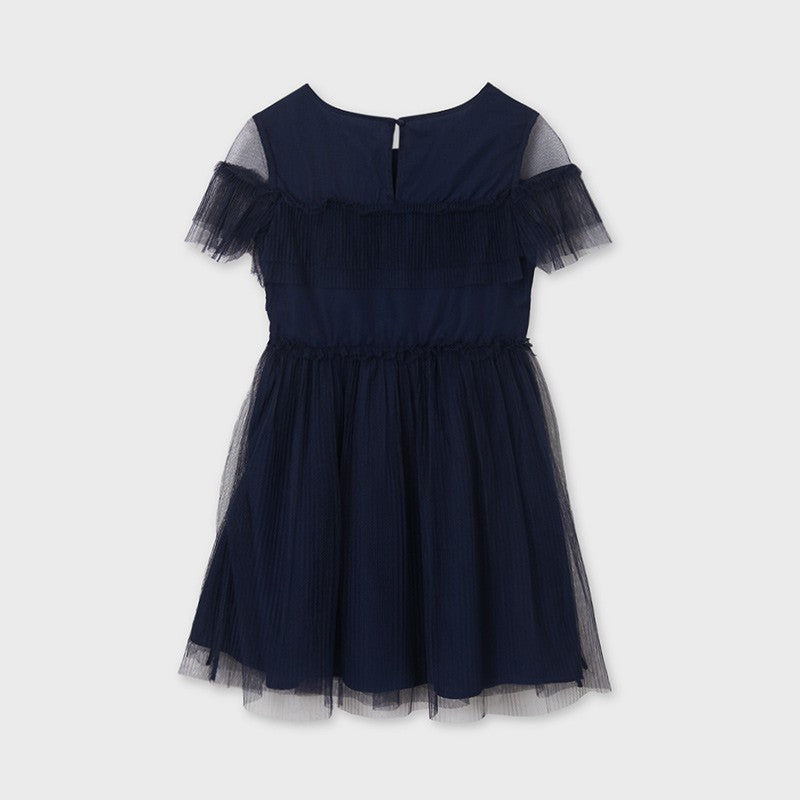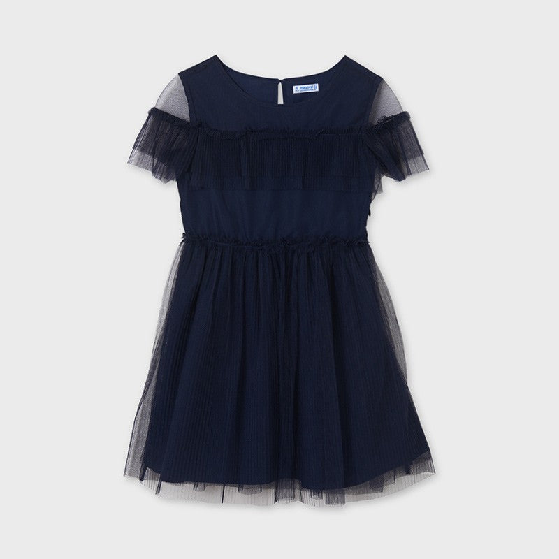 Elegantes Kinder-Tüllkleid mit kurzen Ärmeln und Rüschen, Mayoral, aus der Junior-Mädchen-Kollektion für die Saison Frühjahr/Sommer, Produktcode 6923, Farbe 10 Marineblau. Kinderkleidung für junge Leute.