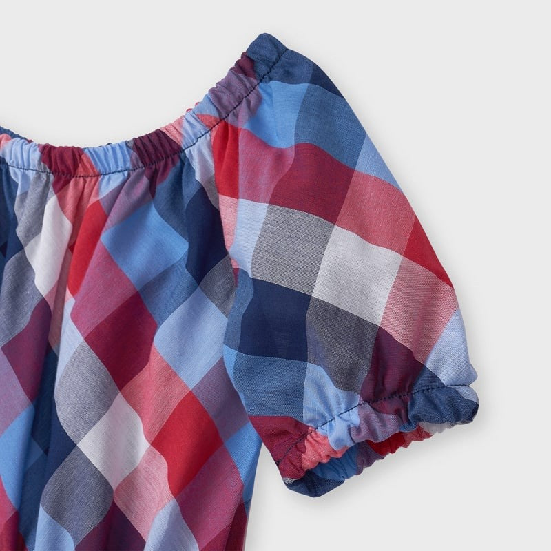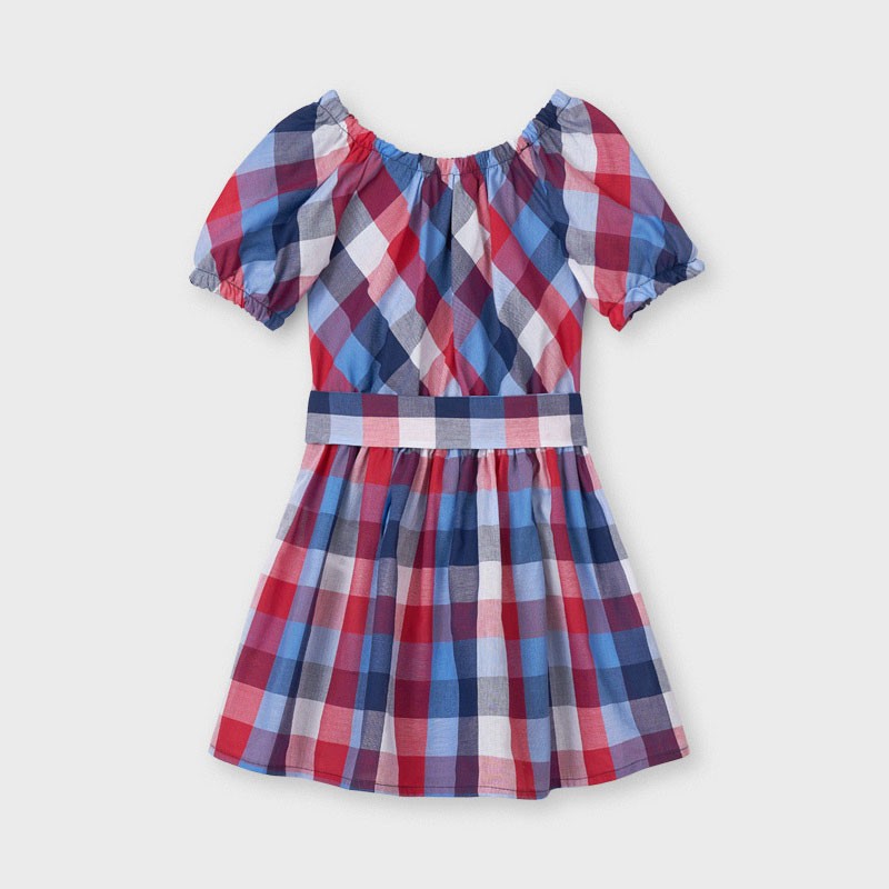 Kinder-Kurzarm-Karokleid mit Bindegürtel für Mädchen von Mayoral aus der Mini-Girl-Kollektion Frühjahr/Sommer, Produktcode 3948, Farbe 3, Rot/Blau. Kinderbekleidung.