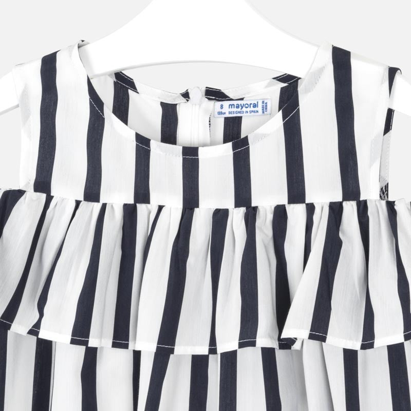 Gestreiftes Kinderkleid mit breiten Trägern und Rüschen für Mädchen von Mayoral aus der Junior-Mädchenkollektion für die Saison Frühjahr/Sommer, Produktcode 6964, Farbe 42 Marineblau. Kinderkleidung für Jugendliche.