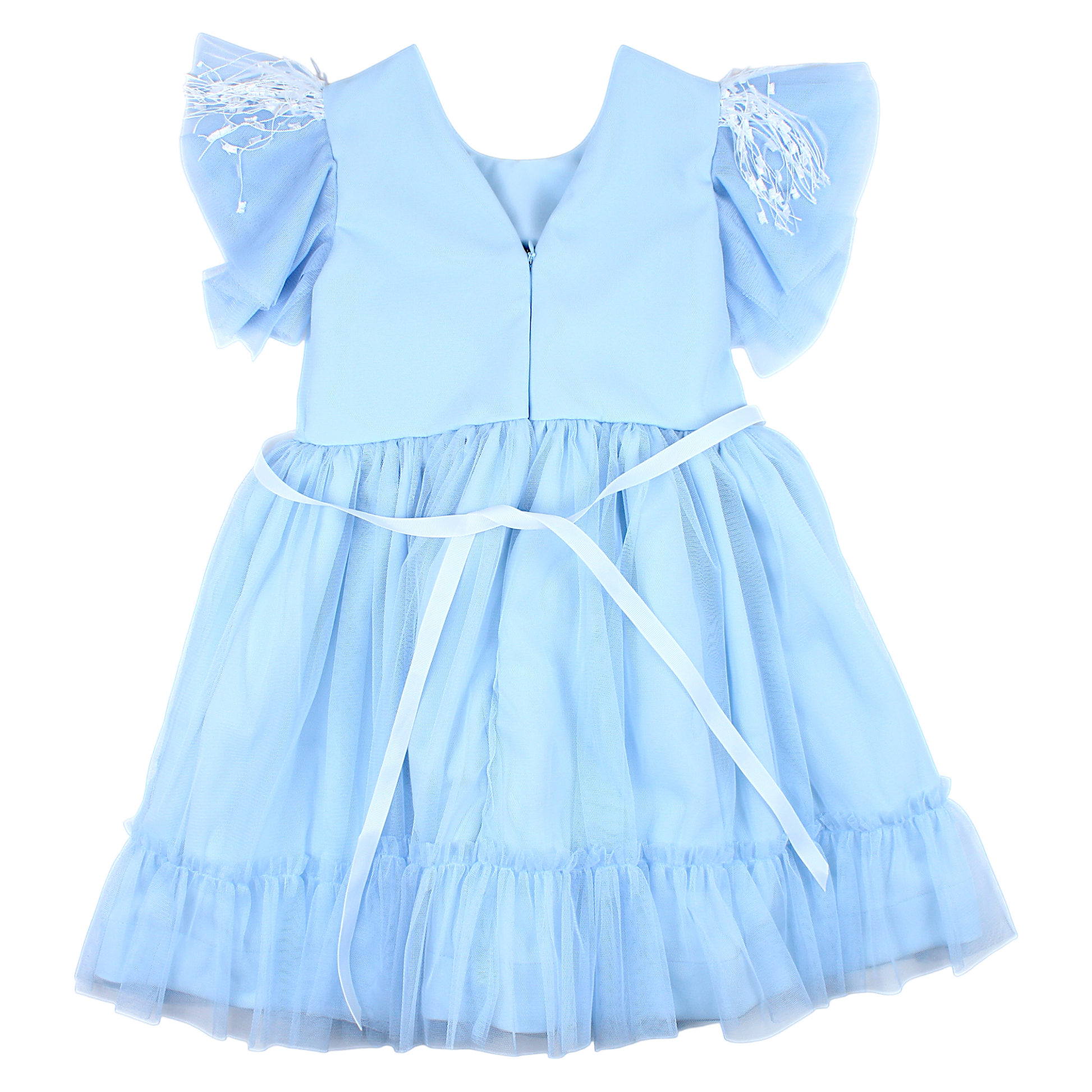 Dieses mädchenhafte Abendkleid in bezauberndem Blau ist perfekt für besondere Anlässe. Es besticht durch wunderschöne Blumenapplikationen , die Eleganz und einen einzigartigen Charakter verleihen. Flügelärmel und sorgfältig verarbeitete Rüschen am Saum verleihen dem Kleid eine leichte Haptik. Ein hübscher, mit einer Blume verzierter Gürtel lässt sich individuell an Ihre Figur anpassen. Das Kleid wird hinten mit Knöpfen geschlossen und erleichtert so das An- und Ausziehen.