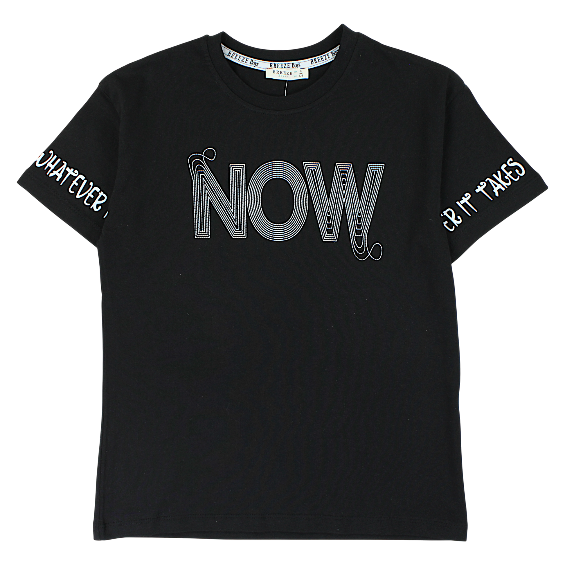 Modisches Jungen-T-Shirt von Breeze mit auffälligem NOW- Print auf der Vorderseite. Klassische Passform, Rundhalsausschnitt , kurze Ärmel und stylischer Print an den Seiten: „WHATEVER IT TAKES“. Dieses schwarze T-Shirt ist die perfekte Wahl für jeden Tag und lässt sich gut mit vielen Outfits kombinieren – egal ob Jeans oder sportliche Jogginghose . Weiche, atmungsaktive Baumwolle sorgt für ganztägigen Tragekomfort.
