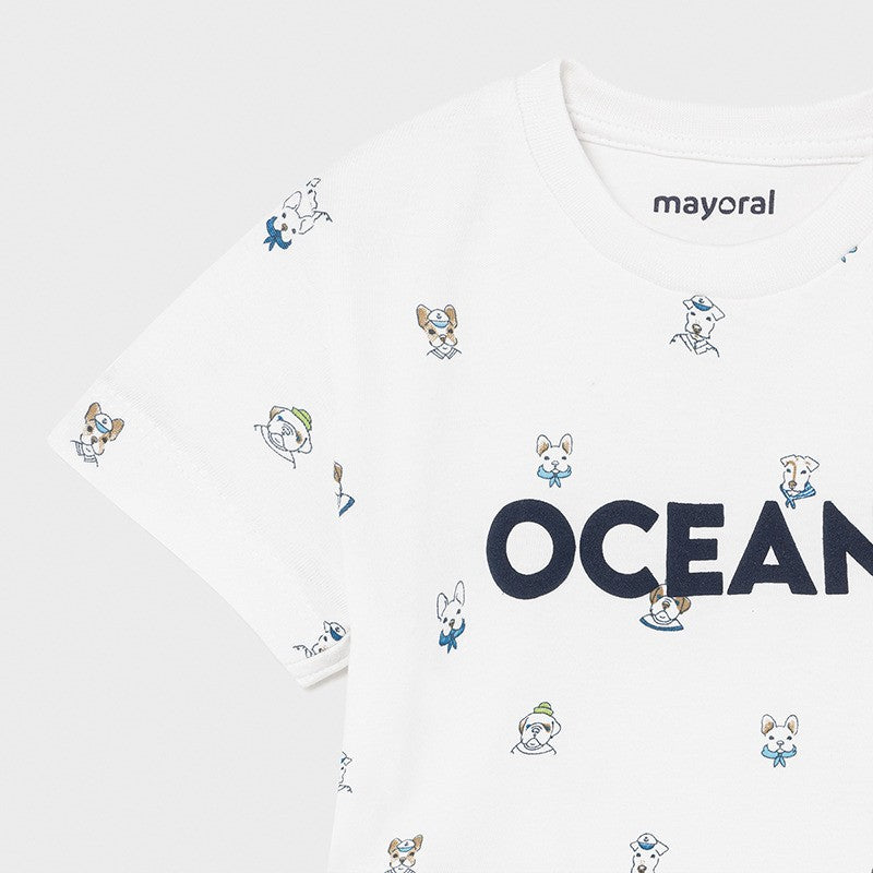 Set aus zwei kurzärmeligen Baumwoll-T-Shirts für Jungen aus der Frühjahr/Sommer-Baby-Kollektion von Mayoral, Produktcode 1008, Farbe 17 Gelb. Kinderkleidung.